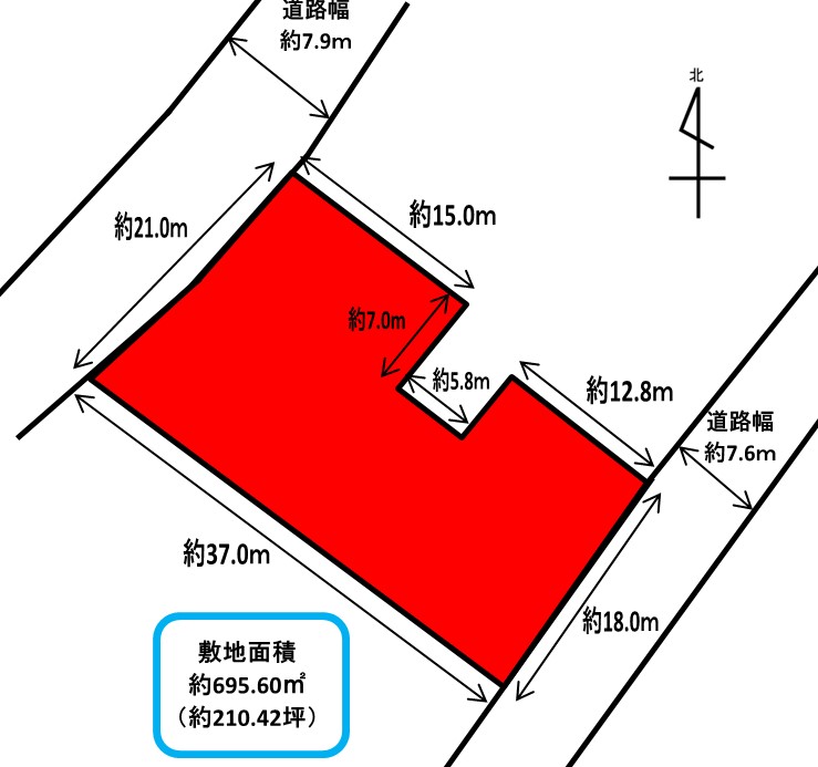 | 接道状況 | 状況:一方 南西側 幅員7.9m 公道に21m接面 南東側 幅員7.6m 公道に18m接面 |