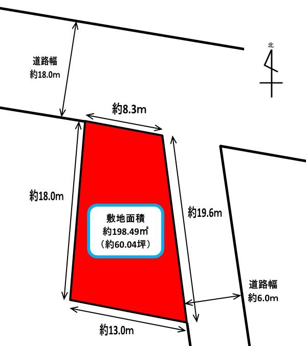 | 接道状況 | 北側 幅員18m 公道に8.3m接面 東側 幅員6m 公道に19.6m接面 |